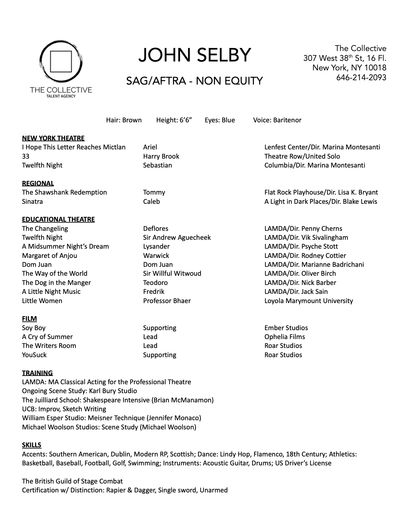 John Selby is a New York-based actor, playwright, and screenwriter. Originally from Cleveland, Ohio he holds a BA in Screenwriting from Loyola Marymount University and an MA in Classical Acting for the Professional Theatre from LAMDA. He has previously studied under Jennifer Monaco, Michael Woolson, and Brian McManamon and currently trains with Karl Bury. With a background in screenwriting, he brings a strong sense of story, rhythm, and subtext to performance and is drawn to complex characters navigating identity, family, and grief.